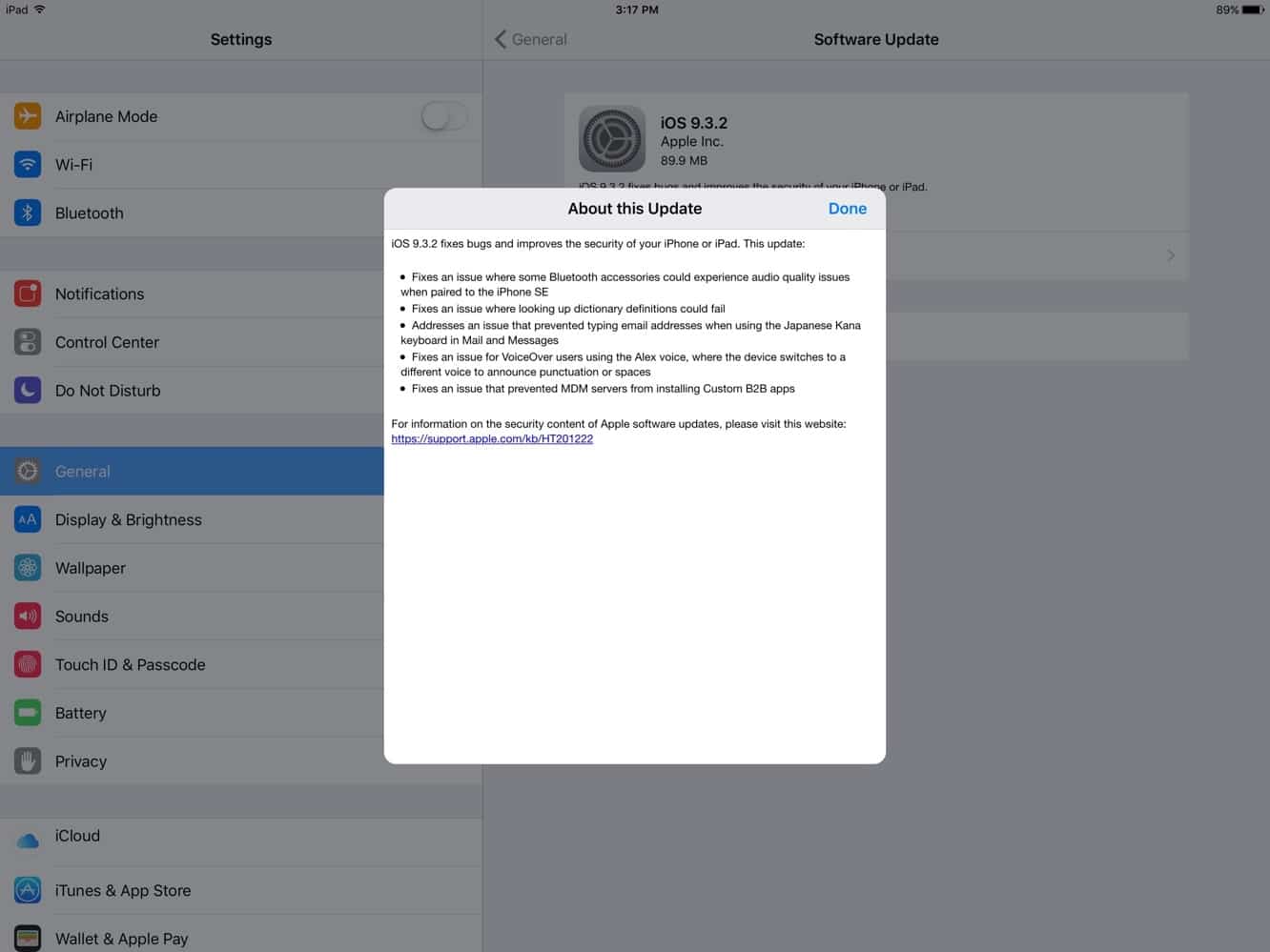 MacRumors notes that they have heard several reports that Apple is replacing iPad Pro devices that have been bricked by the update as no other fix is available for the problem. Users who have not updated to iOS 9.3.2 should see iOS 9.3.1 as the latest version available; other iOS devices appear to be unaffected and the update remains available for all other models.