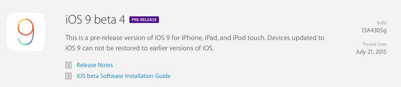 Featuring a build number of 13A4305g, the fourth iOS 9 beta lacks specific release notes, but likely continues to focus on improving the stability and reliability of the new features in the operating system.