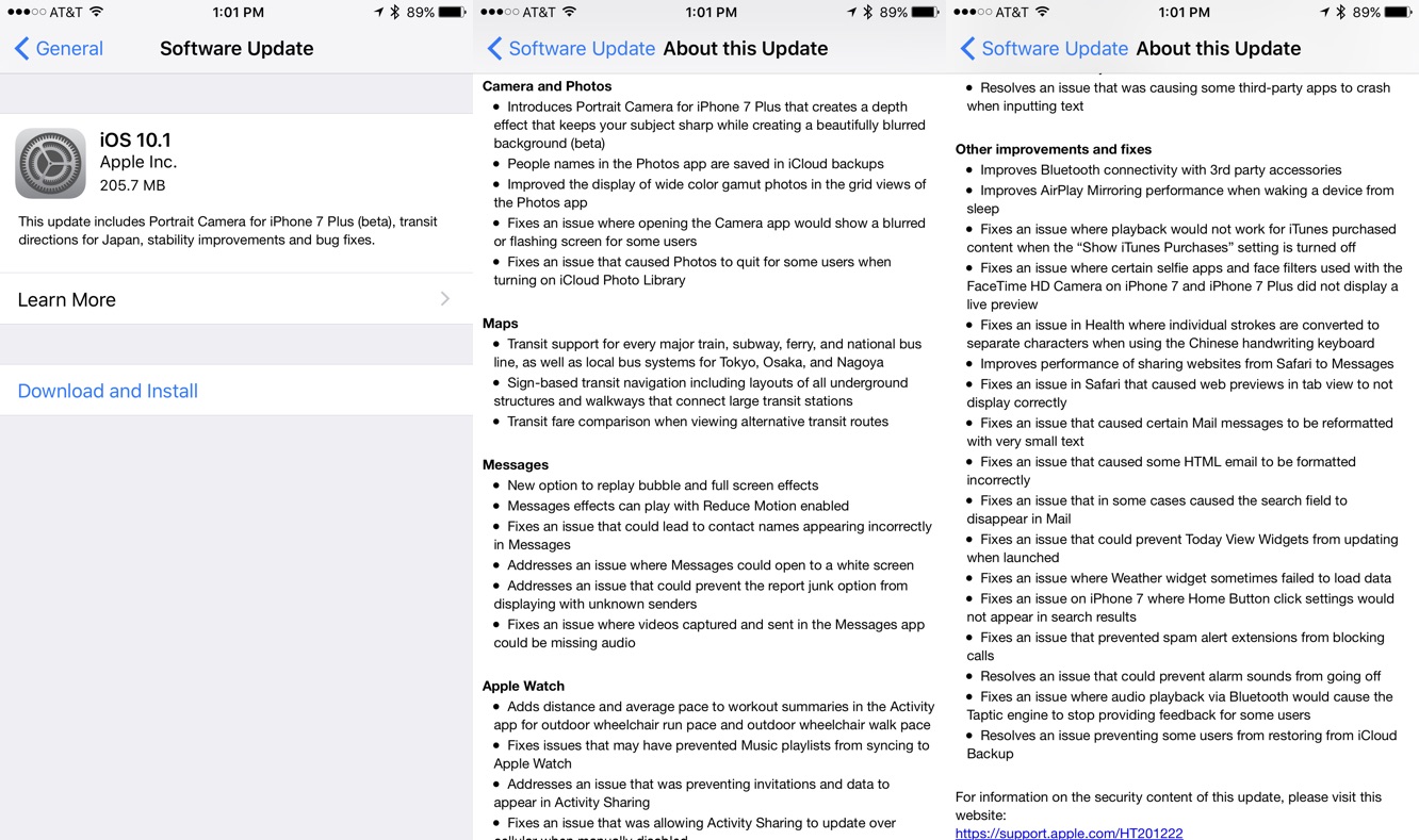 The update contains the beta version of Portrait camera mode for iPhone 7 Plus users, transit support in Maps, new wheelchair tracking workout summary information in Activity for Apple Watch users, improved Bluetooth connectivity, and a series of bug fixes and other minor improvements.
