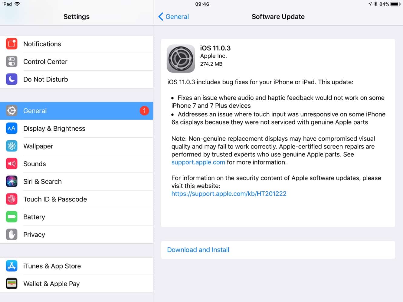 Apple has released iOS 11.0.3, a minor update for iPhone, iPad, and iPod touch users that addresses specific issues with iOS 11 on older iPhone models — audio and haptic feedback problems on the iPhone 7 and iPhone 7 Plus and unresponsive touch input on some third-party iPhone 6s displays.