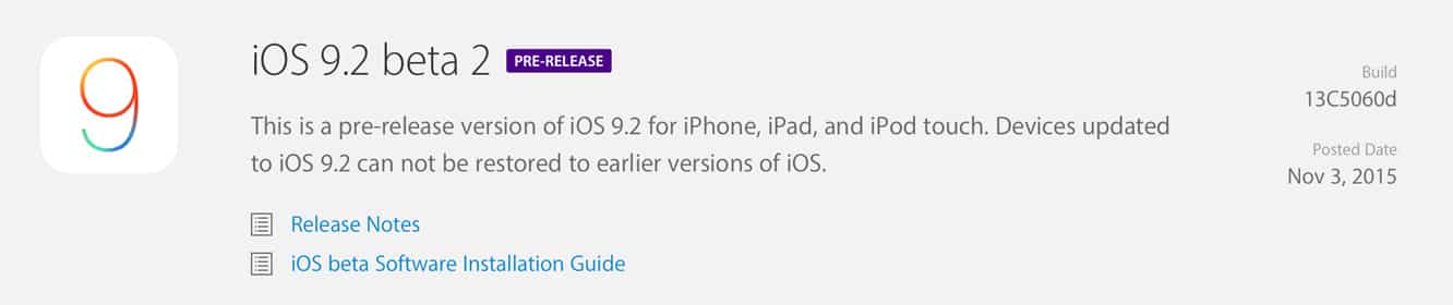 Apple is continuing its more rapid iOS development cycle with the release of the second iOS 9.2 beta to developers. This second beta, build number 13C5060d, again features sparse release notes that focus on minor fixes to UI and developer API issues, specifically focused on Apple Watch support, audio, dictionary, iCloud Keychain, networking, Safari, Video, and Wi-Fi calling.