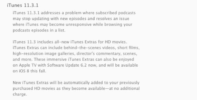 Apple has released iTunes 11.3.1, a minor update that fixes a few podcast bugs — one problem caused podcast subscriptions to stop updating with new episodes, and another issue caused iTunes to become unresponsive while browsing podcast episodes.