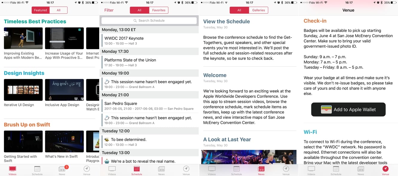 The app now provides curated video playlists based on featured themes, a new “Venue” tab that provides information on the venue, and interactive venue and street maps for the local area. The update also adds an iMessage app that provides some exclusive stickers for WWDC attendees to share.