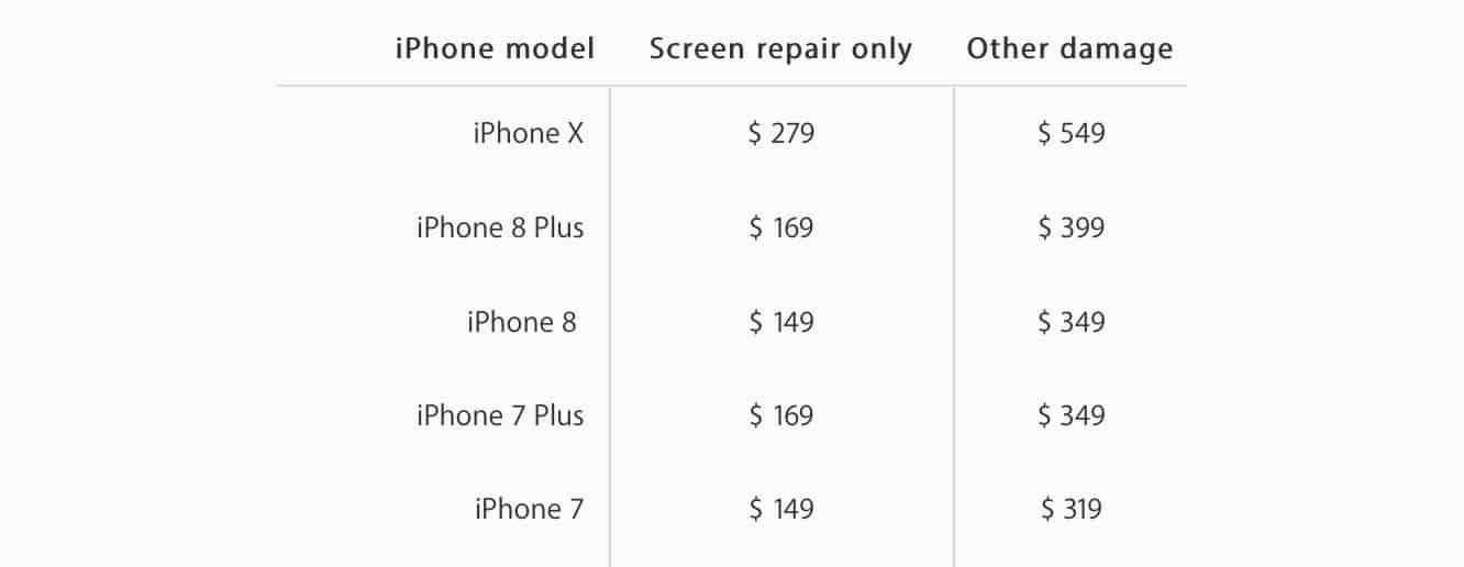 These service prices are for users without AppleCare+ for the iPhone X, however, which costs $199 up front but provides up to two repairs at $29 for screen replacement or $99 for other damage.