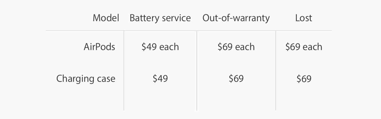 Apple has updated its iPhone Service Pricing page with a section detailing the service prices related to its new AirPods.