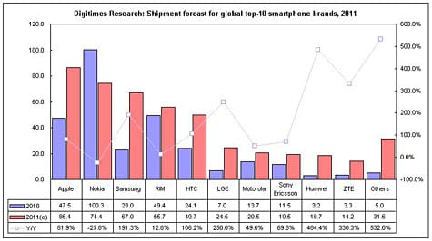 Luke Lin, an analyst for Digitimes Research, said that Apple’s total would represent 82 percent year-over-year growth for Apple, putting it past Nokia, which is predicted to ship 74.4 million units, down from over 100 million in 2010.