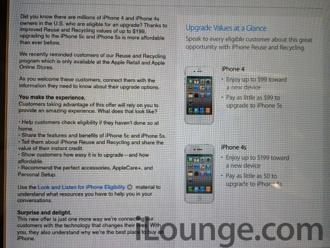 Apple is preparing to increase the trade-in values for the iPhone 4 and 4S in an attempt to get more customers to upgrade to an iPhone 5s or 5c, according to internal documents obtained by iLounge. The company will now offer up to $199 for an iPhone 4S, and up to $99 for an iPhone 4 trade-in when upgrading to a new device — allowing users to upgrade to an iPhone 5s for $0 or $99 depending on which model is traded in.