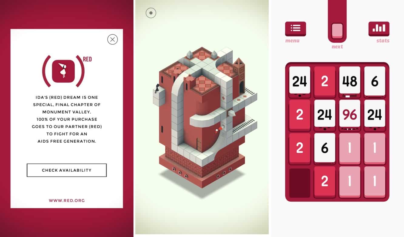 Examples of new (PRODUCT)RED content include an exclusive “(GarageBand)RED” loop pack in Apple’s iOS GarageBand app, an Ida’s (RED) Dream chapter in Monument Valley, a free (PRODUCT)RED theme in Threes, and an in-app purchase of detailed information on the RED Planet: Mars in Star Walk 2.