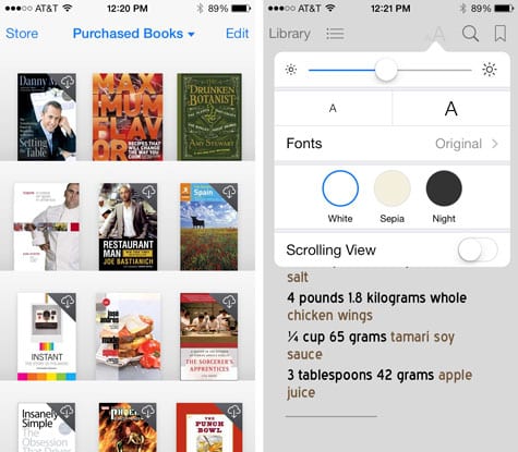 Like most of the new iOS 7 design philosophy, the updated apps depart from the prior skeuomorphic textures and book-like visual elements such as wood shelves, covers, and page depth, the visual page turning animations remain in place much as they were before, although expanding the animation to include on-screen controls and intersecting into the status bar.