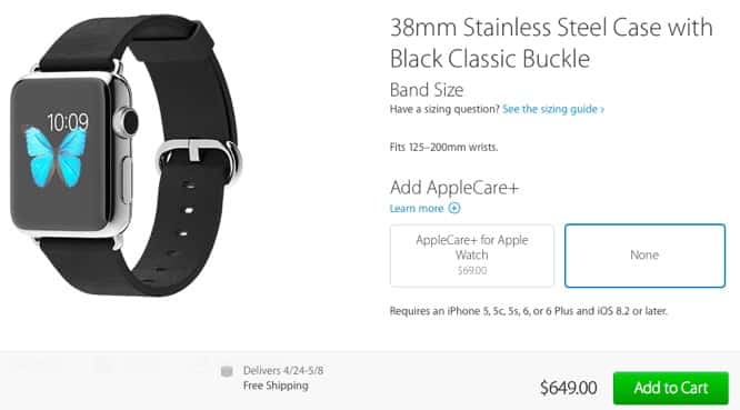 The earliest shipping time available was a two-week estimate — the official April 24 launch date to May 8. As of this writing, only one Watch model in the entire lineup — the 38mm stainless steel Watch with Black Classic Buckle — has that same early shipping estimate. Sport models are now showing June for a shipping estimate, stainless steel models with Sport bands are getting 4-6 week estimates, while some other stainless steel models are showing June or July as an estimated shipping time.