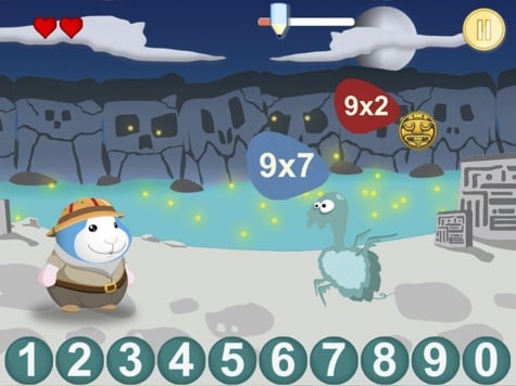 Peapod Labs’ just-released Bugsy’s Math Quest ($3) stars the company’s long-time mascot, Bugsy the hamster, who walks through 2-D side-scrolling levels, facing animals and monsters every few seconds. To get past most opponents, you need to tap once or twice on the bottom-of-screen keypad to enter digits that solve a multiplication or division problem. Each level ends with a boss encounter akin to a quiz, where you need to rapidly solve a handful of problems in a row to defeat the boss and move on. The game’s flat graphics and audio are pretty good, improving on what we’ve previously seen from Peapod’s Bugsy titles, but even the easy difficulty level will prove challenging for the young (4-5-year-old) children the app claims to be appropriate for.