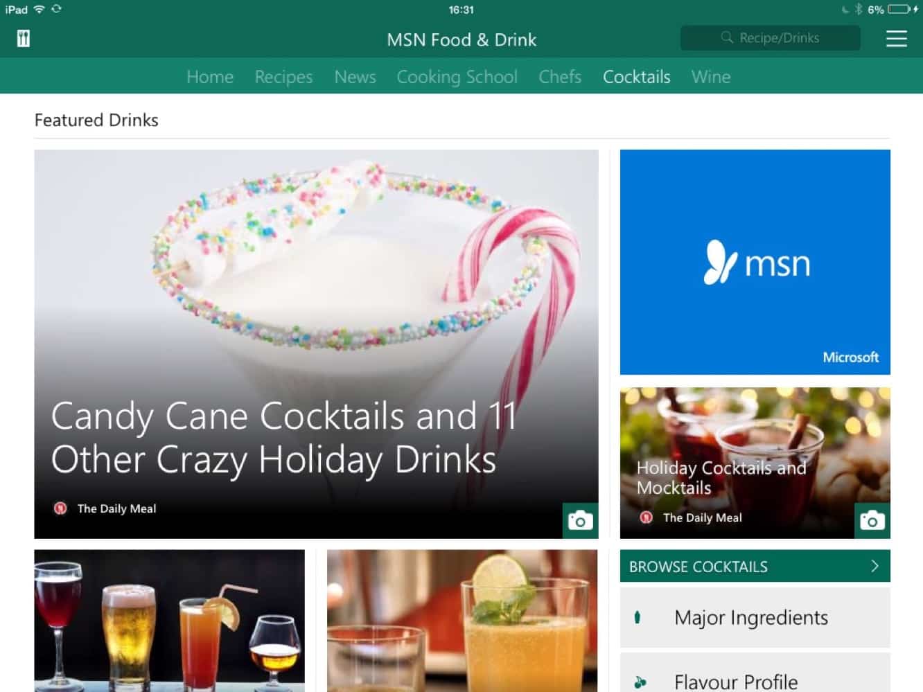 MSN Food & Drink (free) — This is a recipe and food information app that provides access to hundreds of thousands of recipes curated from magazines, world-famous chefs, and other online sources, complete with straightforward instructions and elegantly presented photos. An extensive set of wine and cocktails guides are also included, along with tasting notes and reviews on more than 1.5 million wines. Recipes can be searched and filtered by type of cuisine, source, ingredients, dietary needs, difficulty, methods, prep time, and more. A collection of how-to videos with cooking school tips and techniques is also provided.