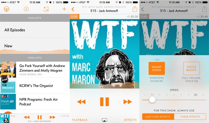 Overcast: Podcast Player (free) — There is no shortage of thoughtfully designed podcast apps made to replace Apple’s own app, which has been through many ups and downs since it was released. The latest, and perhaps most hotly anticipated, is Marco Arment’s Overcast. The app is currently iPhone-only, available as a free download. It’s fully usable as-is, although a $5 in-app purchase unlocks a number of features that enhance the experience, such as cellular downloads, a sleep timer, and unlimited playlists. The key features that help differentiate this one from the others on the market, apart from aesthetic design, are both audio engineering tricks that get unlocked when you spend the money. Smart Speed is a really cool tool; rather than increasing the speed of the podcast and making the speakers sound like chipmunks, it’s able to detect gaps and edit out the silence, saving you time in listening.