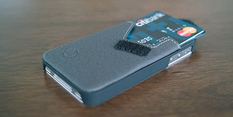 The Wallet Stand is a snap-on style hard polycarbonate case that features a fabric back, an integrated pouch that stores up to 2 cards or cash, and a stiff, flap for the pocket that doubles as a kickstand and secures itself to the back of the case using Velcro when it’s not needed.