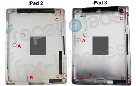 A photo of a purported “iPad 3” rear housing has appeared online, and shows a number of small—but notable—changes between it and the iPad 2. According to Fix-iPhones’ RepairLabs, the new shell provides mounting holes for a smaller logic board, which the report suggests is to make more room for an even larger battery.