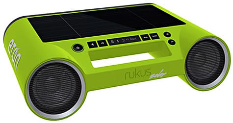 Designed for portability, the Rukus features an integrated carry handle, two full-range speaker drivers, an embedded 40 square-inch solar panel that can completely charge the unit in six hours of direct sunlight, an internal lithium battery, an integrated USB port for charging mobile devices on the go, an e-ink display, and onboard playback controls.
