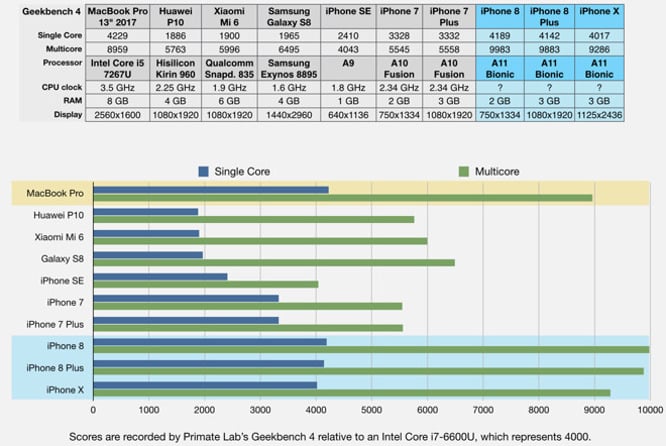 The multicore scores astoundingly even top out above the 13” MacBook Pro, although AppleInsider is quick to note that a laptop’s CPU is tasked with driving a much larger display. That also likely accounts for why the iPhone 8 tests better than the iPhone 8 Plus, and why the 8 Plus tests better than the X; namely, the higher the screen resolution, the more the processor has to work to run it and the less it will be able to dedicate to other tasks.