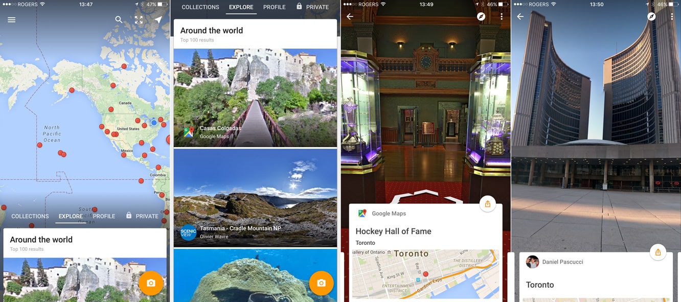 The new Google Street View app takes this one step further, adding the ability to now explore Street View collections and content from Google Maps and photo spheres contributed by other users. In addition to creating and contributing photo spheres from the iPhone camera, the new app also adds support for connecting to external spherical cameras.