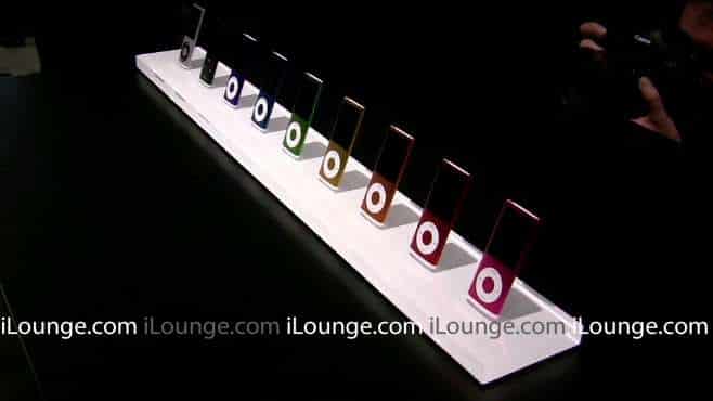 Colors: We had the chance to do straight color comparisons between all of the new iPod nanos and the older second- and third-generation colors. The new shades have reverted to the second-generation colors, but with only slight differences. Most different is the silver version, which has gone a little darker; the black one (shown in the room, not in Steve Jobs’ demo) is almost identical to the charcoal one from the third-generation family.