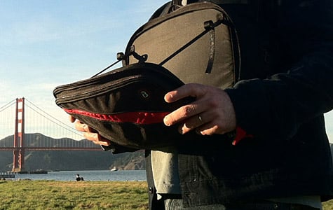 The Somersault is a sling-style backpack featuring a unique swiveling design that allows it to be moved from the front to back for easy use, a unique reversible design that allows it to serve as a platform for iPad use, embedded magnets for compatibility with the iPad 2’s auto sleep/wake functionality, two medium storage compartments, a smart phone pocket, a large main storage area with room for a MacBook Air, a camera access flap, removable shoulder straps, dual utility hooks, and a stylus holder.