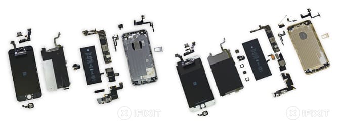 In terms of chip sets, both models are basically identical, containing an Apple A8 CPU with 1 GB RAM, and a collection of radio and controller chips from Qualcomm, Broadcom, RF Micro Devices, SkyWorks, NXP, and Texas Instruments.