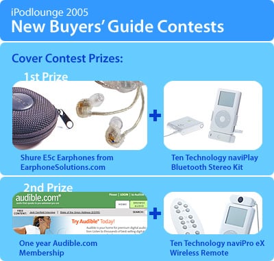 Submit the winning front cover image for the iLounge 2005 Buyers’ Guide and you’ll win two awesome prizes: a pair of Shure E5c deluxe earphones (value: $499.99), courtesy of Earphonesolutions.com, and a TEN Technology naviPlay Bluetooth portable wireless transmitter/receiver set (value: $199.95), courtesy of TEN. A second place winner will win a free one-year subscription to Audible (value: $263.40), courtesy of Audible, and a new TEN Technology naviPro EX remote control system (value: $49.95), courtesy of TEN.
