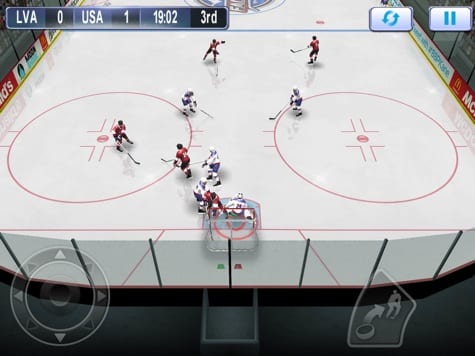 Winter Games positions itself somewhere between an arcade and simulation hockey game. Players have the opportunity of making strategic decisions before starting a game, though it’s hard to tell how much it really matters when everyone’s flying toward the net at every chance. The controls are simple — a virtual joystick on the left side, and three buttons on the right, two of which change from shooting and passing on offense to poke checking and body checking on defense. A sprint button is also there, whether you have the puck or you’re defending — its positioning next to the other buttons makes it a little awkward to use.