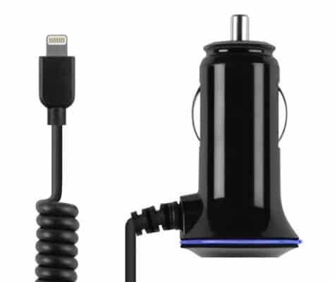 The Dual Auto Charger features a coiled Lightning cable with a pass-through USB port.