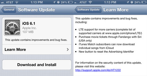Apple today released iOS 6.1, the newest version of the mobile operating system for the iPad, iPhone, and iPod touch. Weighing in at 107 MB, the update can be installed over the air or by connecting to iTunes.
