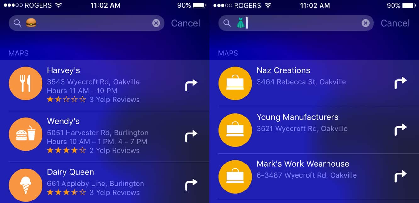 The Spotlight search on iOS devices now provides results for certain emoji. Searching with the hamburger emoji, for example, provides a list of nearby burger joints in Maps. Searching using the dress or pants emoji returns Maps results for clothing stores, while a dress shirt with a tie emoji curiously returns results for clothing retailer apps before the Maps listings.