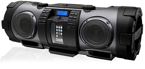 In keeping with the line’s lineage, which dates to 1998, the latest Kaboom! features an oversized, tube-like design, 40 watts of total power, 3-3/16” full-range drivers, 5-1/8” subwoofers, a central iPod/iPhone dock with a sealing door to prevent damage, a USB port for connecting other audio sources, a CD player, an FM radio, an auxiliary input, a 1/4-inch guitar/mic input with mixing capabilities, video output, the ability to run off wall power or 10 D cell batteries, and an included shoulder strap and remote control.