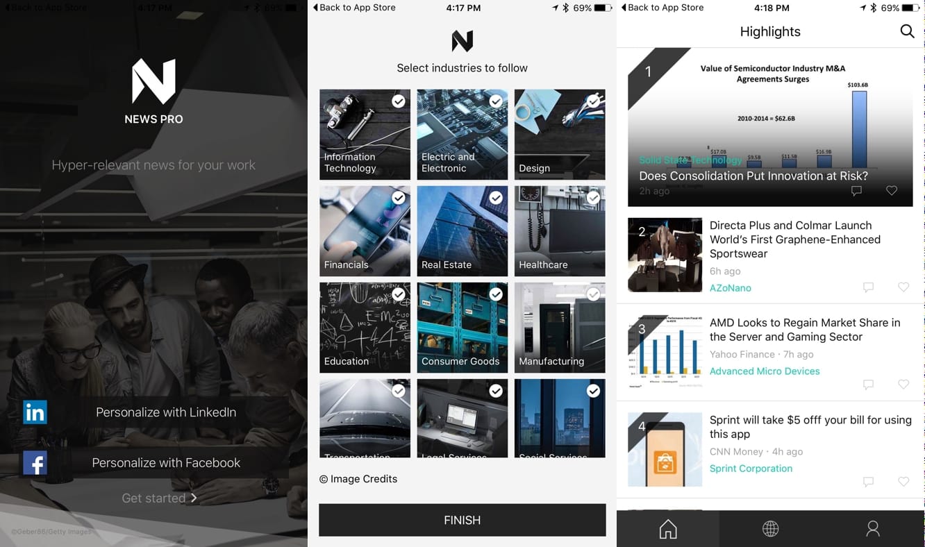 Billed as “Your Work News Brief,” the app is designed to help users search for daily news relevant to their work field, with over a million topics to choose from. Users can link News Pro with their Facebook and LinkedIn profiles to tailor their news feed to their work experience and personal interests, and the app will suggest new topics to explore and web sites to discover based on the user’s current profile.