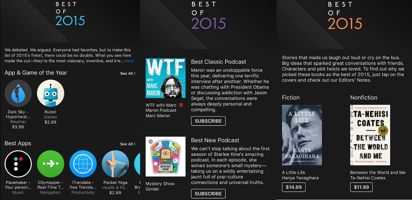 Best Classic Podcast went to WTF with Marc Maron, and newcomer Mystery Show was named Best New Podcast of 2015. Apple also released its picks for best books of 2015 in 16 categories, listed below.