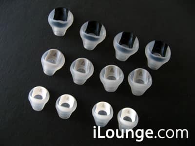 After holding a press conference last month to announce that it would update several parts of its TriPort IE In-Ear Headphones in response to consumer complaints, Bose today delivered the first of those parts: three sets of new silicone ear tips. Substantially similar to their predecessors (shown below, right), which were discussed in our review, the new silicone tips (left) are slightly more firm and designed to remain bonded to the earphones, but do not address the concerns of those who found them uncomfortably shaped and/or unstable in their ears.
