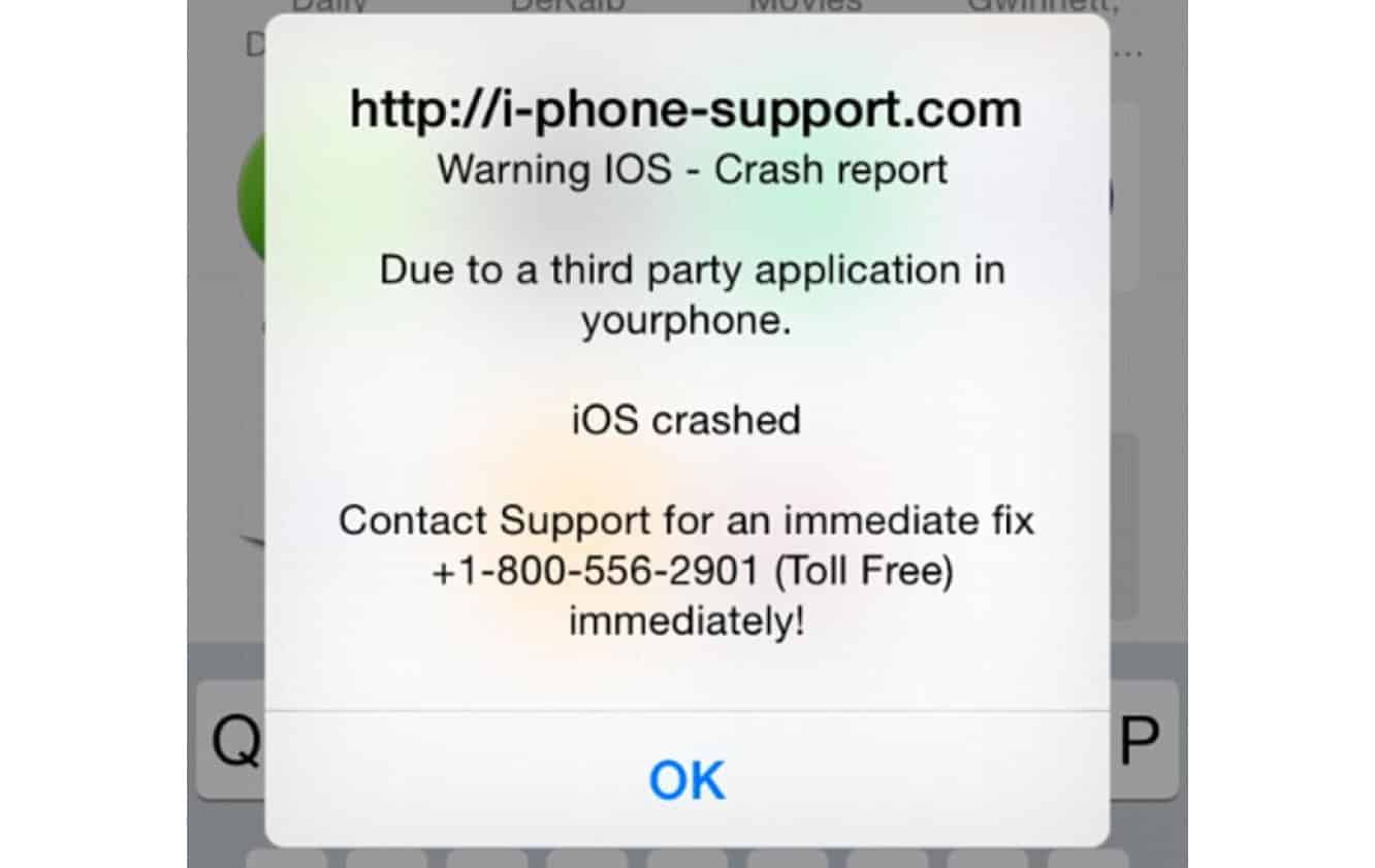 have encountered the scam, which presents a pop-up message in Safari advising them that their device has crashed for reasons such as a “third-party application in yourphone” or “unwanted websites visit” [sic] and advising them to call a number that in some cases is identified as Apple technical support. After calling the number, users are being asked to pay amounts ranging from $19 to $80 to fix the issue. The differing pop-up messages suggests that there may more than one group exploiting the issue.