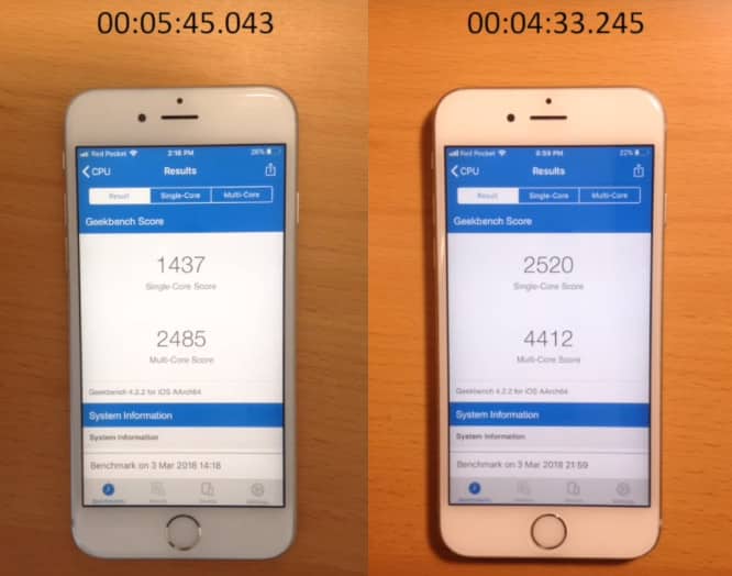 The old battery left the 6s with a single-core Geekbench score of 1437 points and a multi-core score of 2485, where the device scored 2520 and 4412 respectively once the battery was swapped out. While users will soon be able to turn the throttling on and off at will, the video proves there are serious benefits to taking Apple up on its cheap battery replacement offer for eligible iPhones.