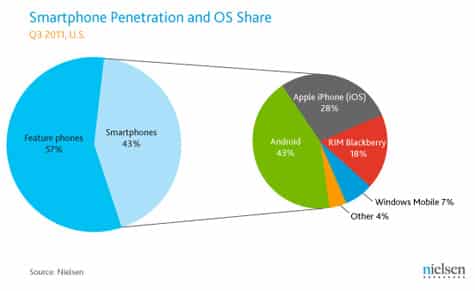 Based on the data, the iPhone accounted for 28 percent of all smartphones in the U.S., while phones based on Google’s Android OS collectively represent 43 percent of the smartphone market. RIM’s BlackBerry accounted for 18 percent, Windows Phone for seven percent, and all other operating systems for four percent.