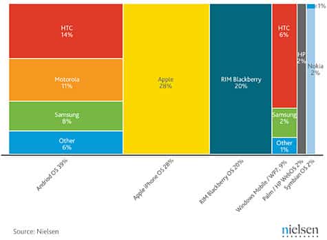 Apple holds a 28 percent share of the handset market, followed by RIM and HTC, each of which account for 20 percent of the market.