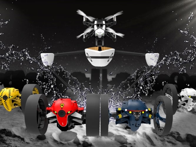 Five new airborne drones have also been introduced, in “night” and “cargo” versions, with the Blaze, Swat, and Mc Clane providing dimmable LED running lights for maneuvering in the dark, and Travis and Mars capable of carrying small cargo loads such as Lego characters or bricks. We reviewed two Parrot Minidrones last year — the Jumping Sumo and Rolling Spider.
