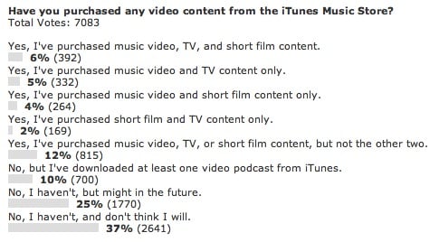 Over 7,000 votes were cast in the poll, which was split between 5 “yes” answers and 3 “no” answers. Collectively, “no” won by a wide margin, with 72% of readers saying that they had not purchased any iTMS videos.