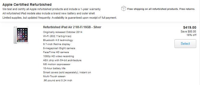 All the refurbished devices are discounted between 15 and 17 percent off the price of a new iPad Air 2 and include a one-year warranty.