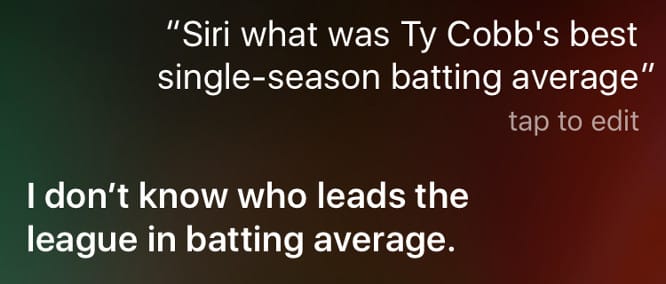 In honor of Opening Day in the MLB, Apple has rolled out some improvements to Siri’s baseball knowledge, but we’ve found there’s still a lot of room for improvement. The personal assistant is supposed to be able to provide more detailed statistics, including historical data going back to the beginning of baseball records, but simple questions like, “What was Ty Cobb’s best single-season batting average?” returned, “I don’t know who leads the league in batting average,” so she can’t even answer the question we didn’t ask, much less the one we did.