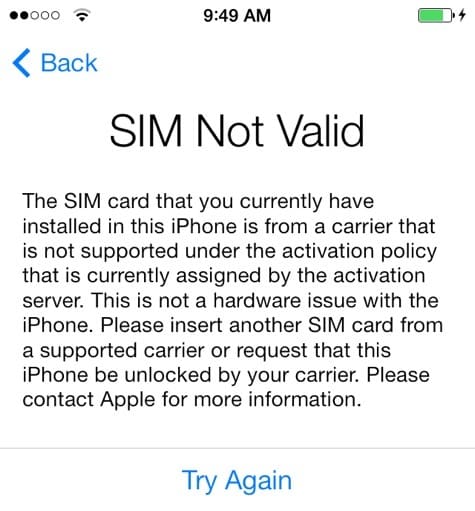 iLounge and a number of readers are experiencing SIM card issues with just-delivered Verizon iPhone 5s units. Affected iPhones display a message reading, “The SIM card that you currently have inserted in this iPhone is from a carrier that is not supported under the activation policy that is currently assigned by the activation server.” The message suggests that the iPhone needs to be used with another SIM card, or unlocked by a carrier, pointing users to Apple for additional information.