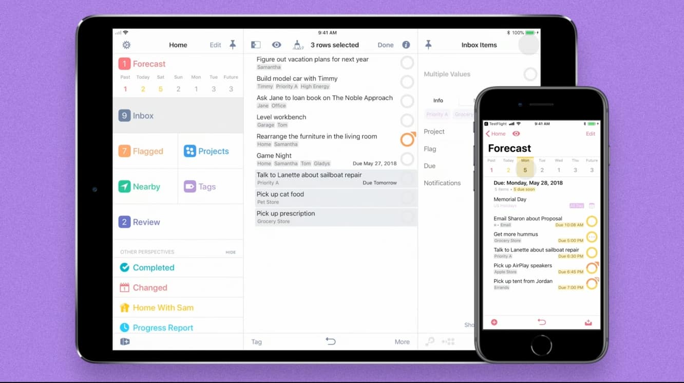 The screen layouts have also been enhanced in OmniFocus 3 for iPad to allow a multi-panel view that takes full advantage of the larger screen, providing a powerful desktop-like experience.
