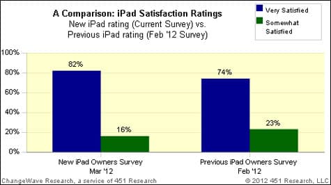 The third-generation iPad has received even higher customer satisfaction ratings than its predecessor, according to a ChangeWave survey. 82 percent of new iPad owners said they were very satisfied with the device—compared to 74 percent for the iPad 2—while another 16 percent said they were somewhat satisfied, compared to 23 percent for the iPad 2.