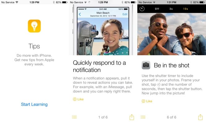 A list of six tips is shown initially, with the first being “Quickly respond to a notification.” Users can like/unlike tips and share tips, as well. All of the tips at this point are iOS 8-specific.