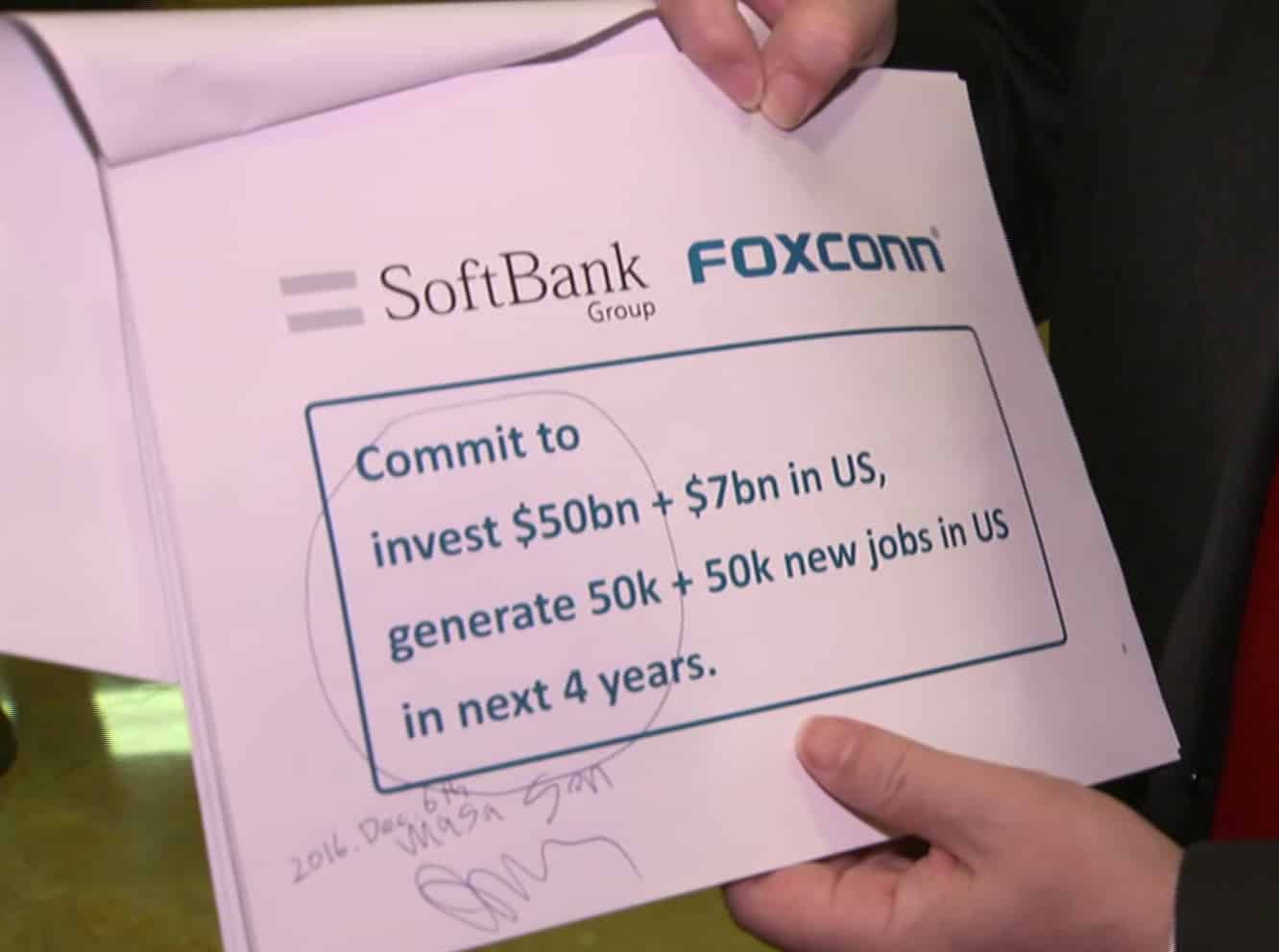 President-elect Donald Trump and SoftBank Group Corp.’s Masayoshi Son during the announcement of a $50 billion investment in the U.S. by the bank. While the page listed the figures “$7 billion in U.S.” and “50,000 new jobs in U.S.” on the same page as Foxconn’s logo, the company said “the scope of the potential investment has not been determined” in an official statement, adding, “Those plans would be made based on mutually-agreed terms.”