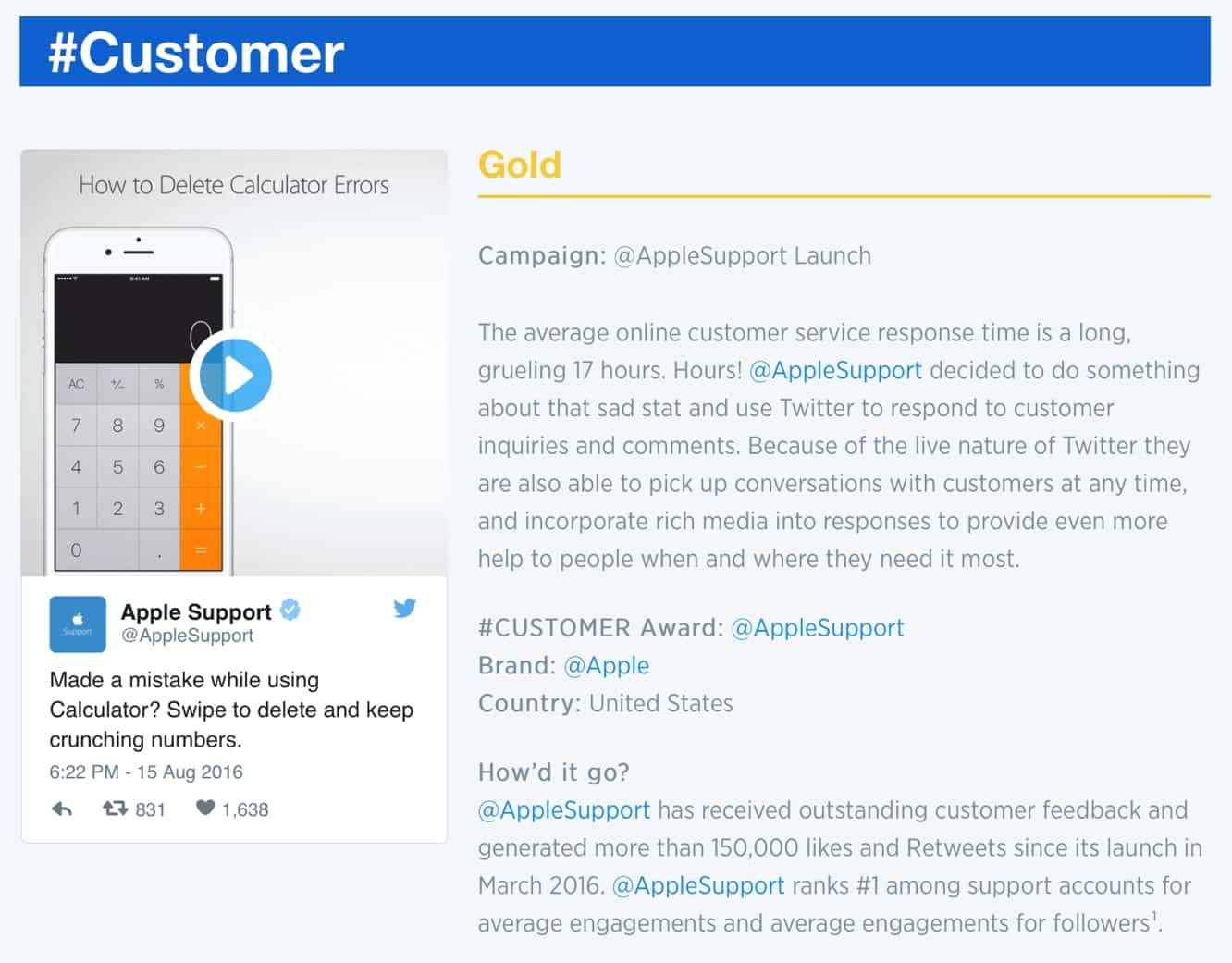 In Twitter’s first annual #TwitterAwards, the social network has presented Apple with the Gold #Customer Award for its highly successful launch of the @AppleSupport Twitter account in 2016 — the first time Apple has operated any kind of official support account on a social networking site.