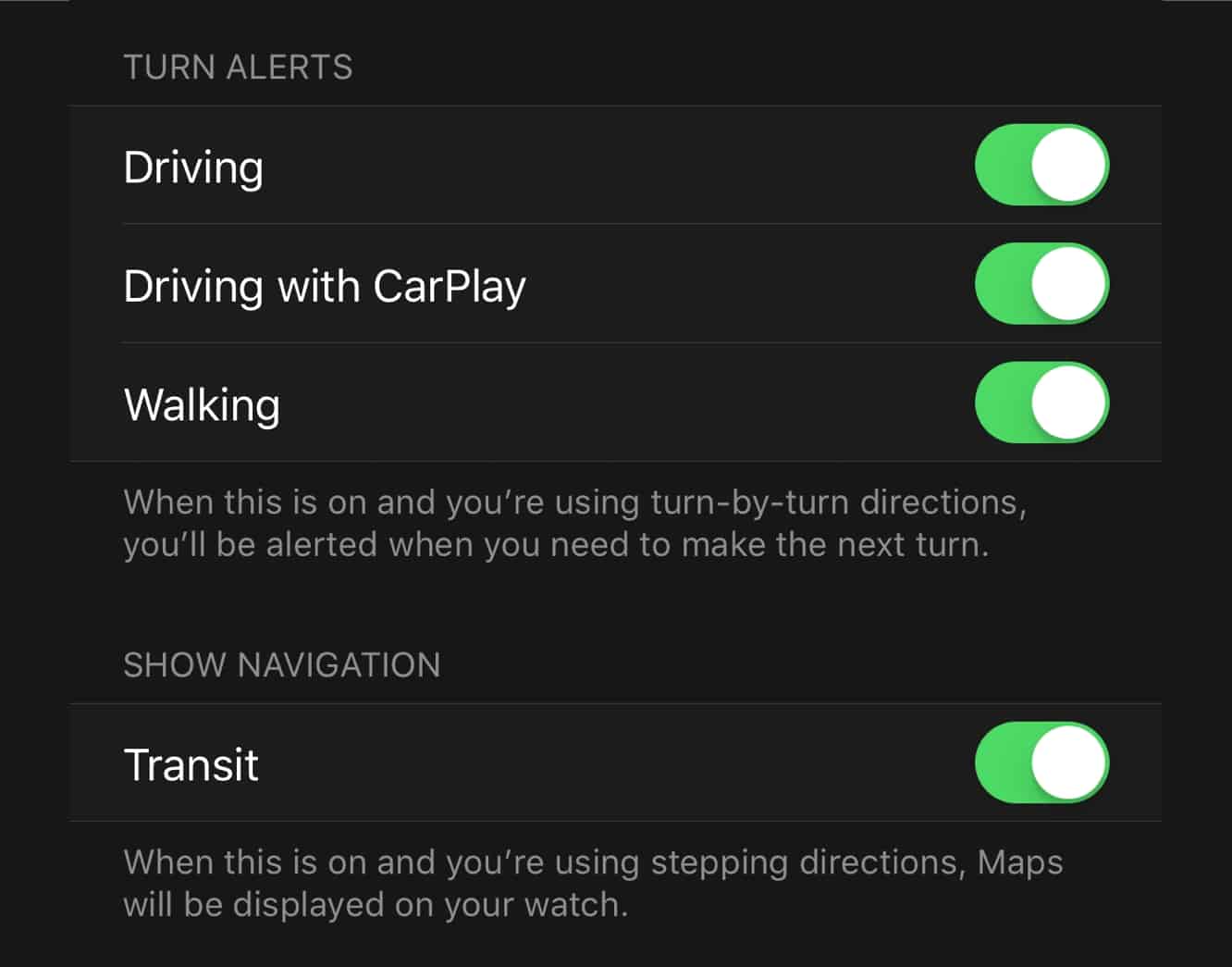 In watchOS 5, however, users will now have the benefit of turning off any specific notifications that they don’t want to receive while navigating. Turn alerts can be turned off for “Driving,” “Driving with CarPlay,” and “Walking” and another switch provides the ability to turn off the display of transit directions from appearing on the watch.