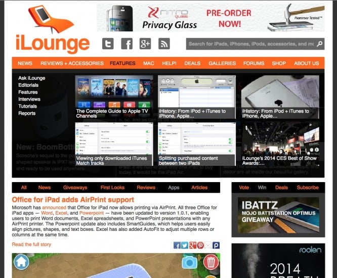 Today, we’ve launched an all-new version of the iLounge web site — seriously streamlined to improve as much of the user experience as possible. The biggest change you’ll notice is the replacement of our old top-of-page, ever-moving “randomizer” with a static collection of our most important links, one each for the iPhone, iPad, iPod/iTunes, Apple TV, and Mac, with a large link to the most noteworthy accessory we’ve recently covered. But there are lots of other changes, too.